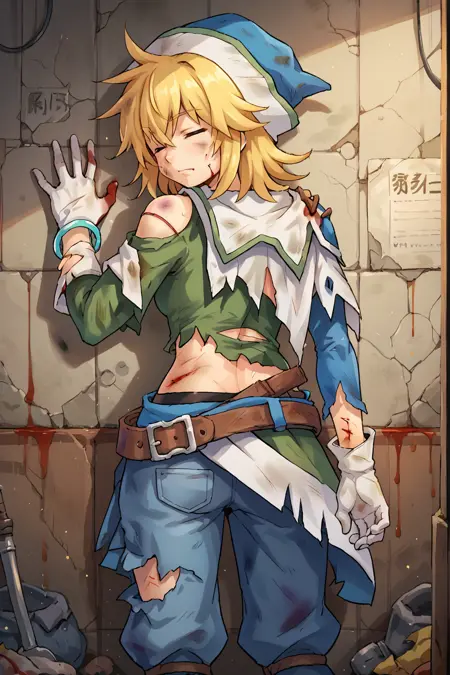 유용한 태그: 1boy, 녹색 눈, 금발, 중간 길이 머리, 모자, 파란색 머리 장식, 비대칭 옷, 십자 끈으로 묶인 옷, 사이드 케이프, 흰색 사이드 케이프, 흰장갑, 맞지 않는 소매, 녹색 소매, 파란색 소매, 파란색 팔찌, 녹색 셔츠, 넉넉한 파란색 바지, 벨트, 어깨 벨트, 검은 양말, 흰부츠,