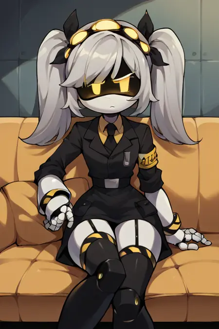 프롬프트: sdJ, 회색 머리, 노란 눈, 로봇, 투명 헬멧, 트윈테일, 검은 정장, 노란 셔츠, 검은 넥타이, 한쪽 팔밴드, 허벅지까지 오는 양말,