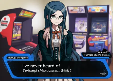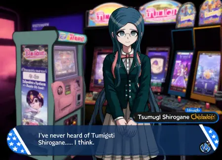 Danganronpa S GUI:それほどうまくいきませんが、以下のプロンプトで試せます。「The image uses danganronpa S GUI style with the danganronpa sprite style. A speech bubble is in the bottom of the image and it says "This is test text!" The speech bubble is in front of Tsumugi. There's a box with a blue background with white stars, and a grey arrow pointing right, beside the speech bubble. The text in the box says "Tsumugi Shirogane" and it is next to the speech bubble.」