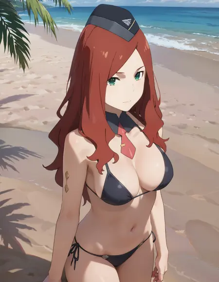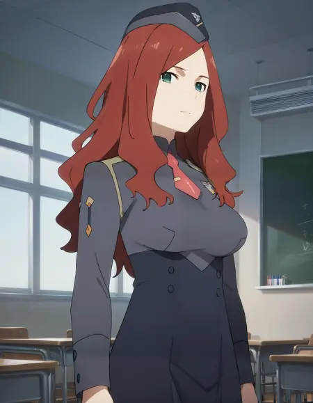 nana_franxx, red hair, long hair, bangs, garrison cap, green eyes, big breast,