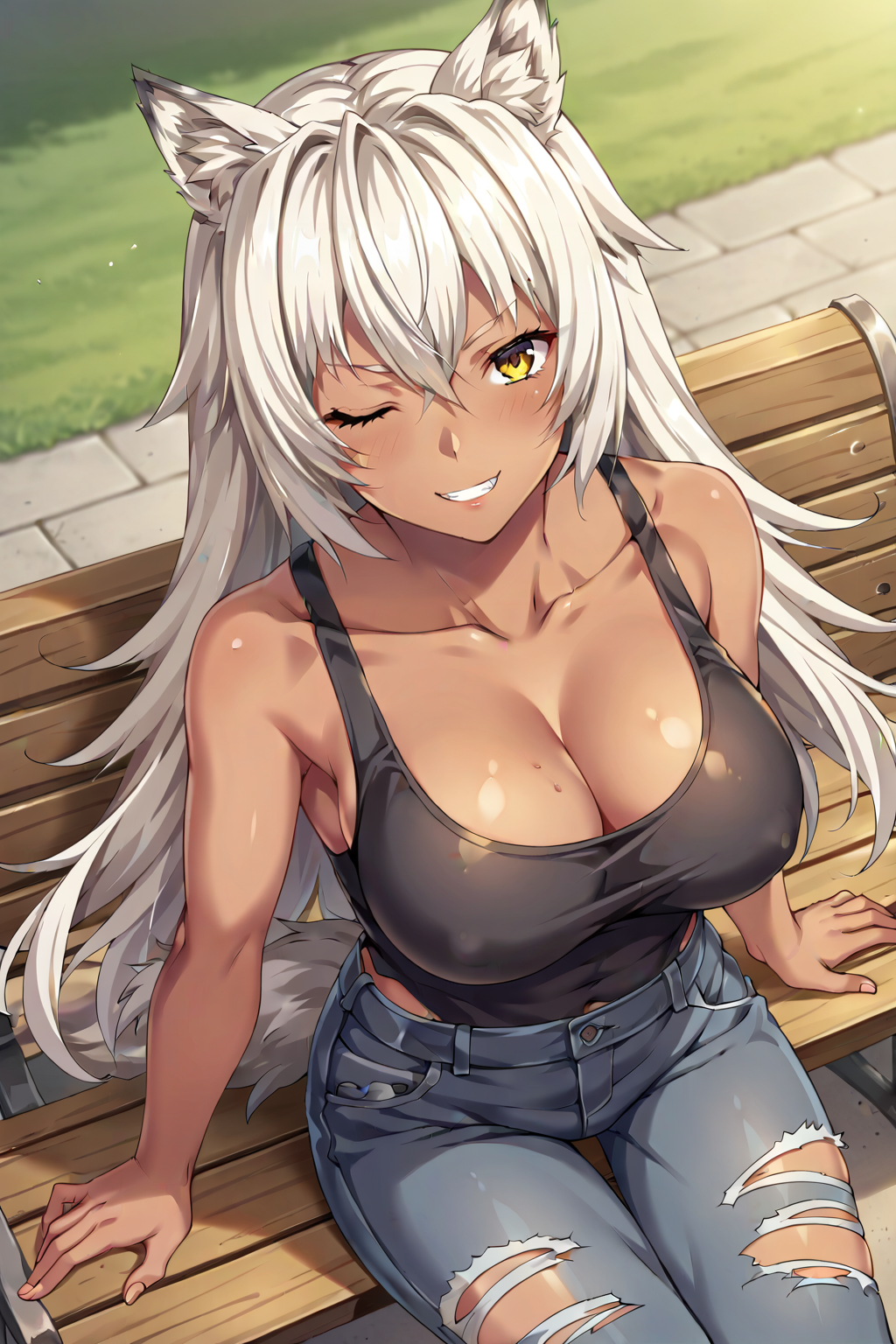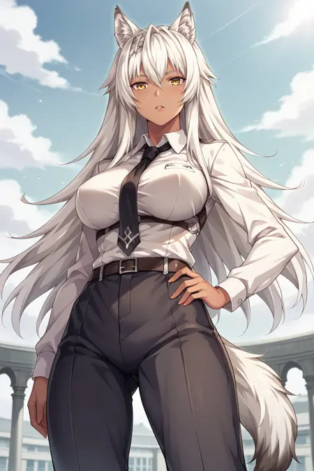 KJOLeona, yellow eyes, white hair, long hair, hair between eyes, wolf ears, dark skin, wolf tail,