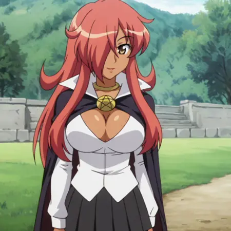트리거: Kirche, 1girl, solo, large breasts, pentacle, dark-skinned female, dark skin, hair over one eye, cleavage, long hair, red hair, cape, skirt, brown eyes, cowboy shot