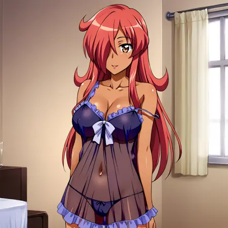 란제리 포함 트리거: KircheLingerie, 1girl, underwear, side-tie panties, large breasts, lingerie, long hair, hair over one eye, cleavage, pink hair, navel, nightgown, cowboy shot