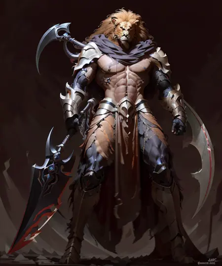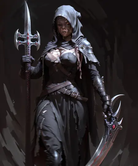 Draws a cloaked executioner, with little tweaking also interesting animal dark knights. Supported weapons = scythe, sword, axe and genders = male and female. See the prompts.