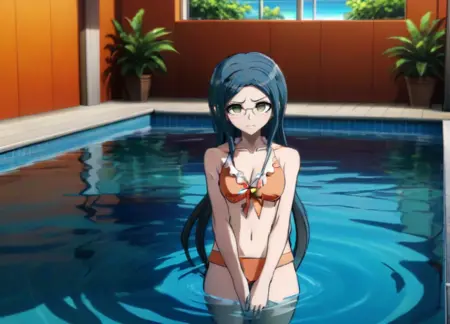 “白银凑身穿《弹丸论破S》泳装。她穿着一件橙色比基尼泳装,上衣为浅橙色,边缘饰有白色蕾丝,中央两片之间有一显著蝴蝶结。下装为与上衣同色的橙色。凑的头发为及膝的青蓝色,中分,发根顺直平滑,发梢渐呈波浪状。眼睛大而圆,呈柔和的青绿色。她佩戴圆形无框眼镜,镜架为白色。”