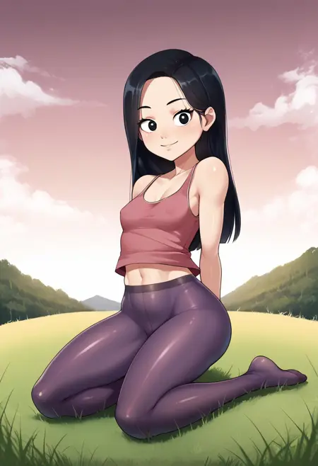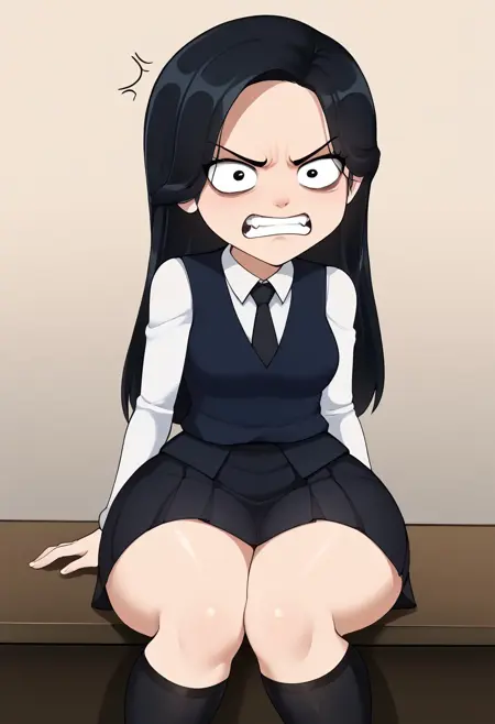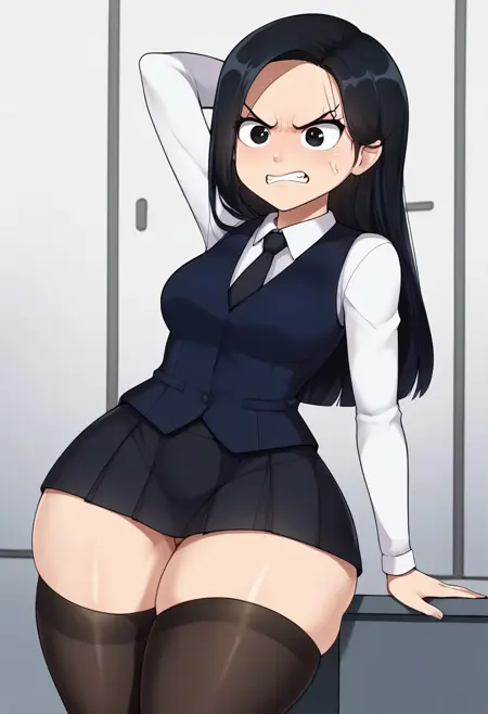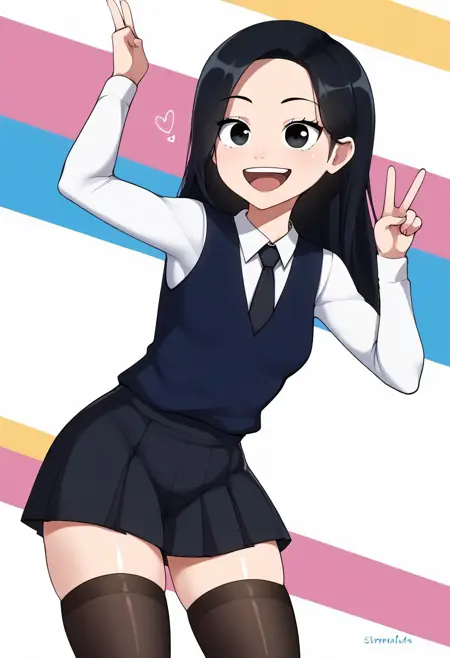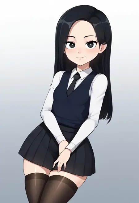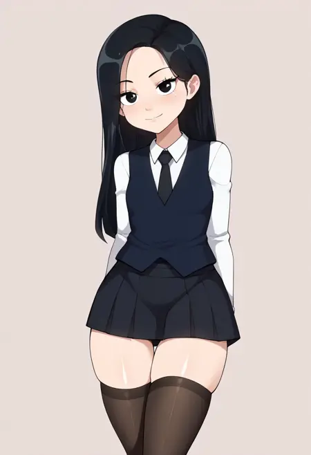 SeraKiaeker, 1girl, black hair, long hair, solo, black eyes, white shirt, long sleeves, dark blue vest, black skirt, school uniform, collared shirt, dark brown stockings, black necktie,