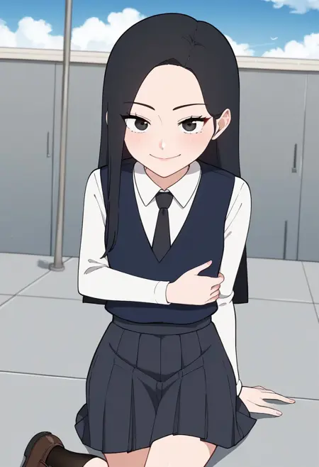 SeraKiaeker2, 1girl, black hair, long hair, solo, black eyes, white shirt, long sleeves, dark blue vest, black skirt, school uniform, collared shirt, dark brown stockings, black necktie,