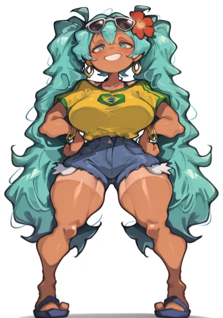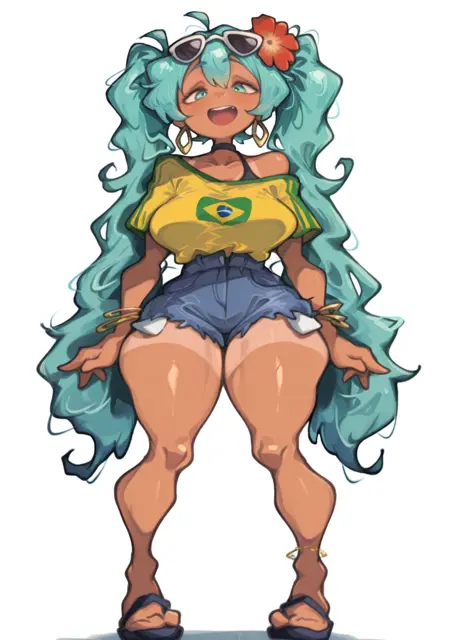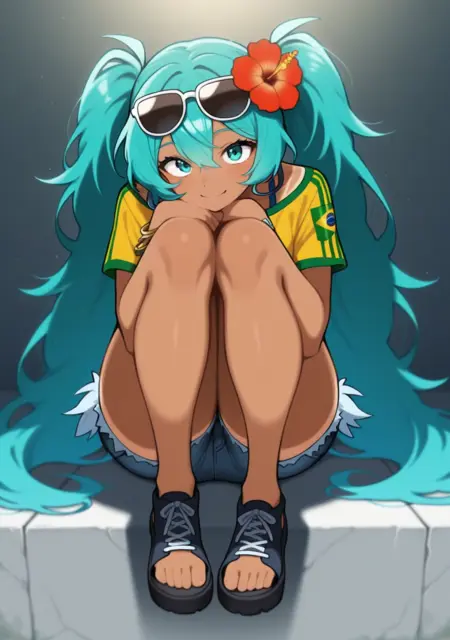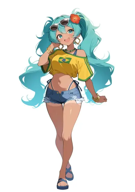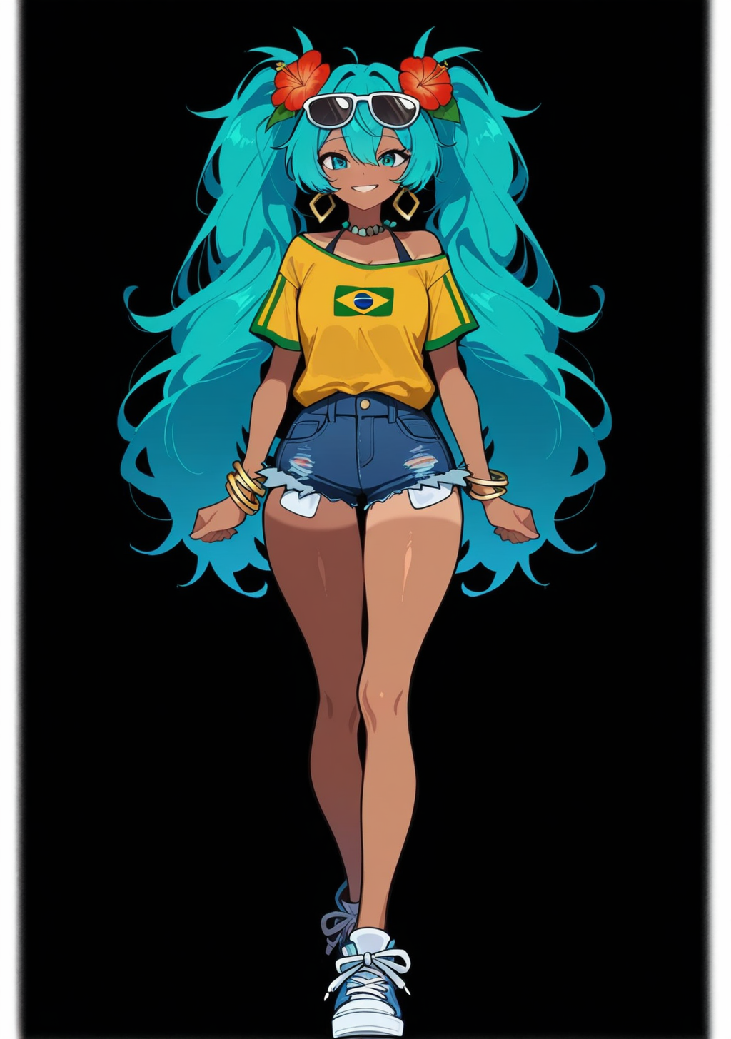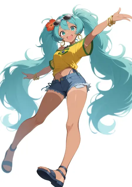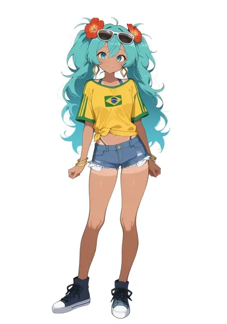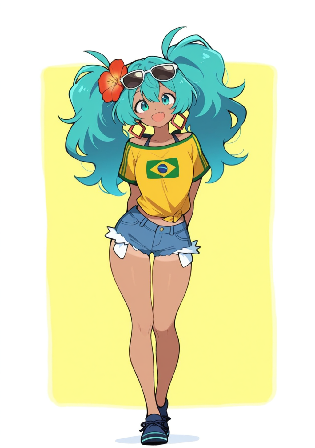 プロンプト: 水色の髪、頭にサングラス、髪に花、黄色のシャツ、シャツにブラジル国旗、デニムショート、ブーティーショート、日焼けした肌、1人の女の子、初音ミク、