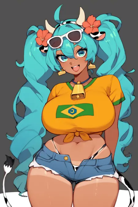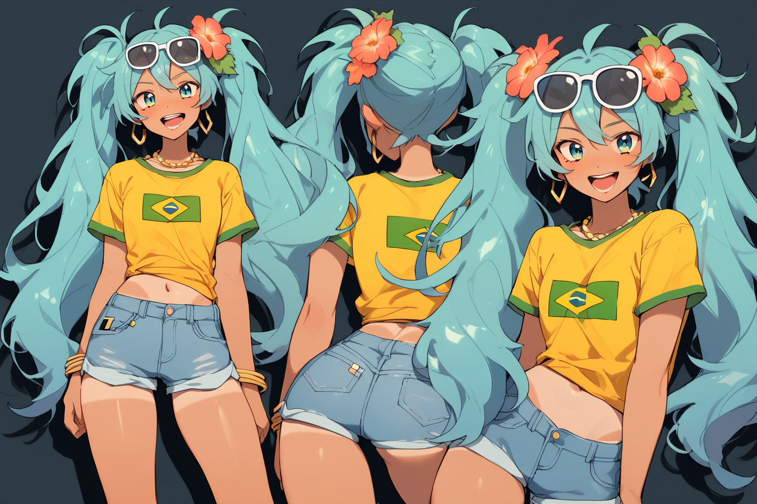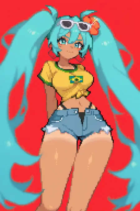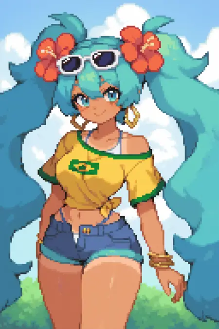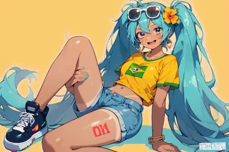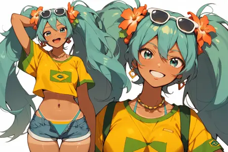 Prompts: aqua hair, sunglasses on head, flower in hair, yellow shirt, brazil flag on shirt, denim shorts, booty shorts, tanned, 1girl, hatsune miku,