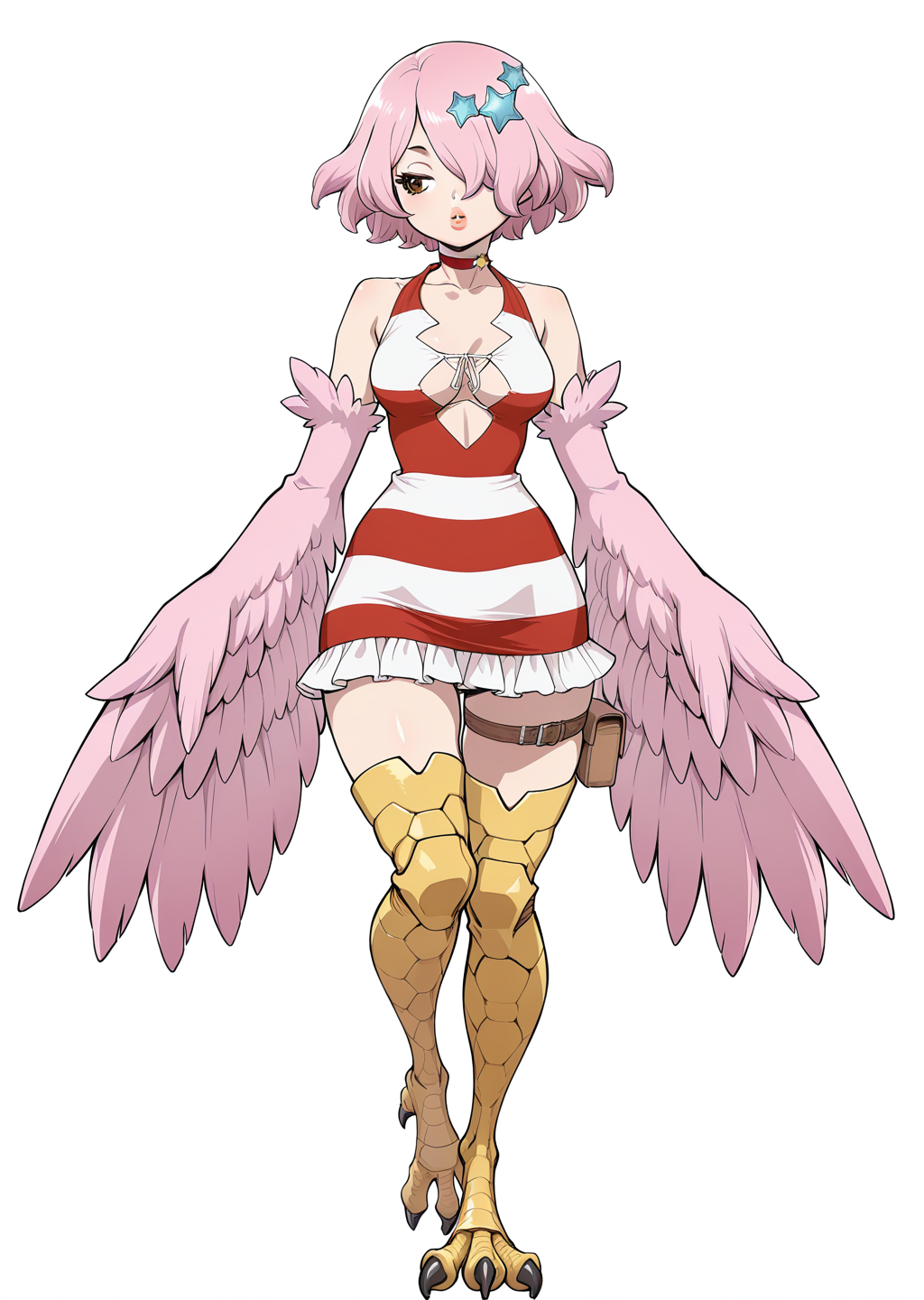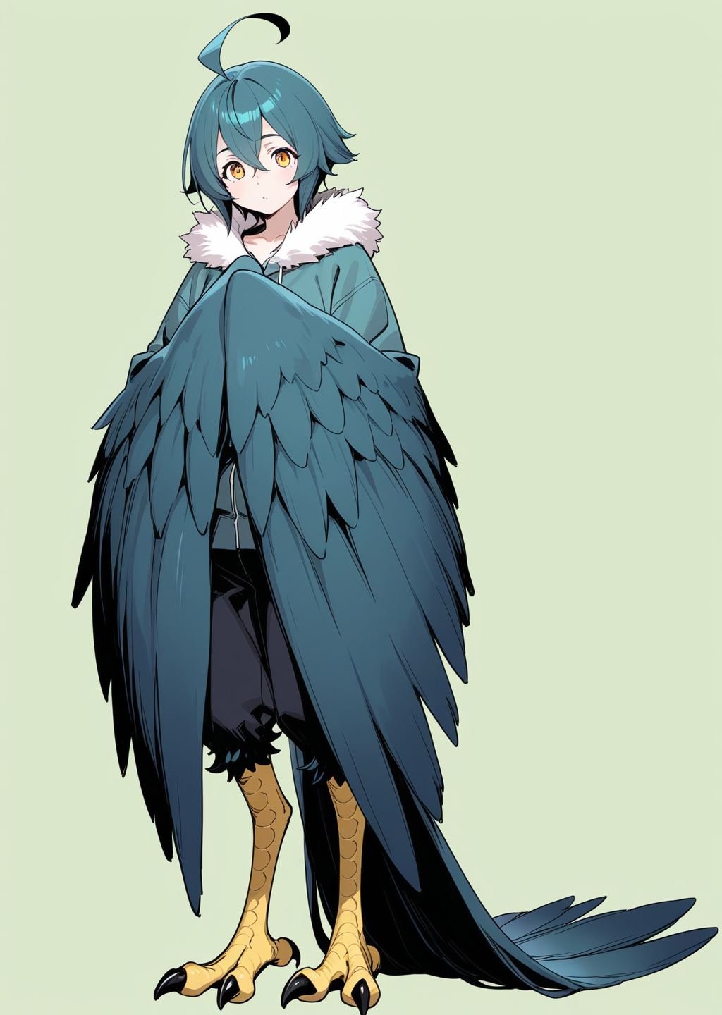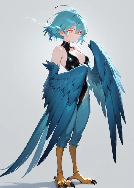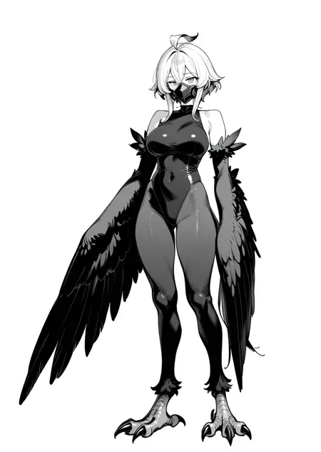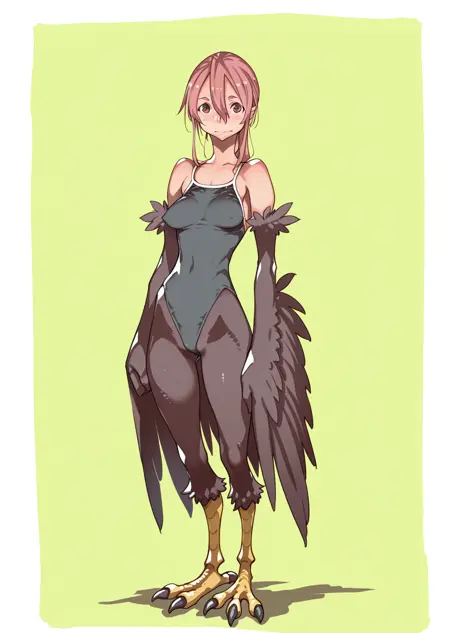 Prompts: Harpy, wings, talons, monster girl, winged arms, feathered wings, bird legs,