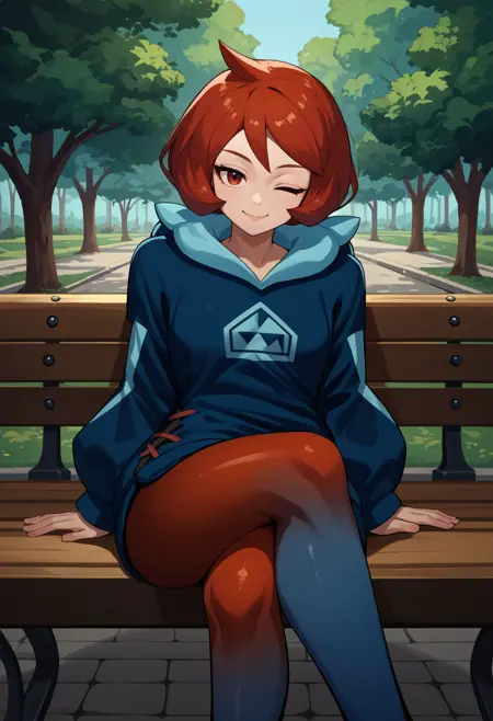 默认服饰: 蓝色连帽衫,帽檐下垂,长袖,渐变腿饰,双色腿饰,红色连裤袜,棕色包