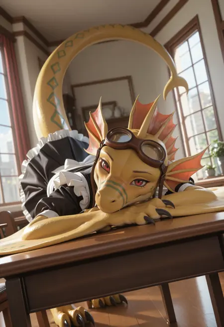 // Illustrious: ad1ne_ange1s_w1th_sca1y_w1ngs, wyvern, tail, claws, goggles, furry, 1girl, goggles on head