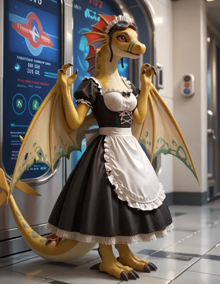 // Illustrious: ad1ne_ange1s_w1th_sca1y_w1ngs, wyvern, tail, claws, goggles, furry, 1girl, goggles on head