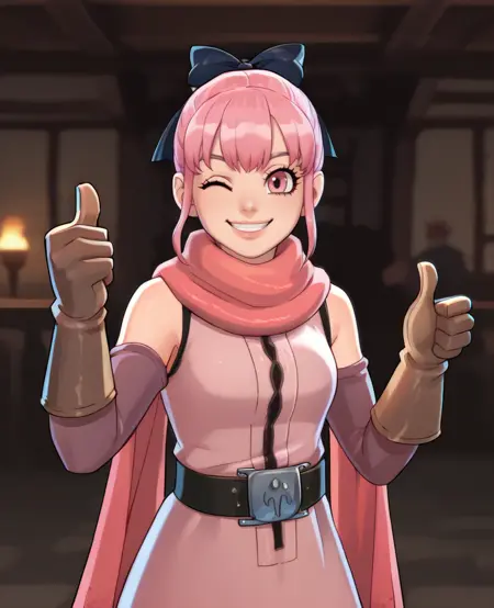 black hair ribbon, tunic, scarf, gloves, belt, bare shoulders, skirt, - thighighs, garter straps, pink shorts, brown boots,