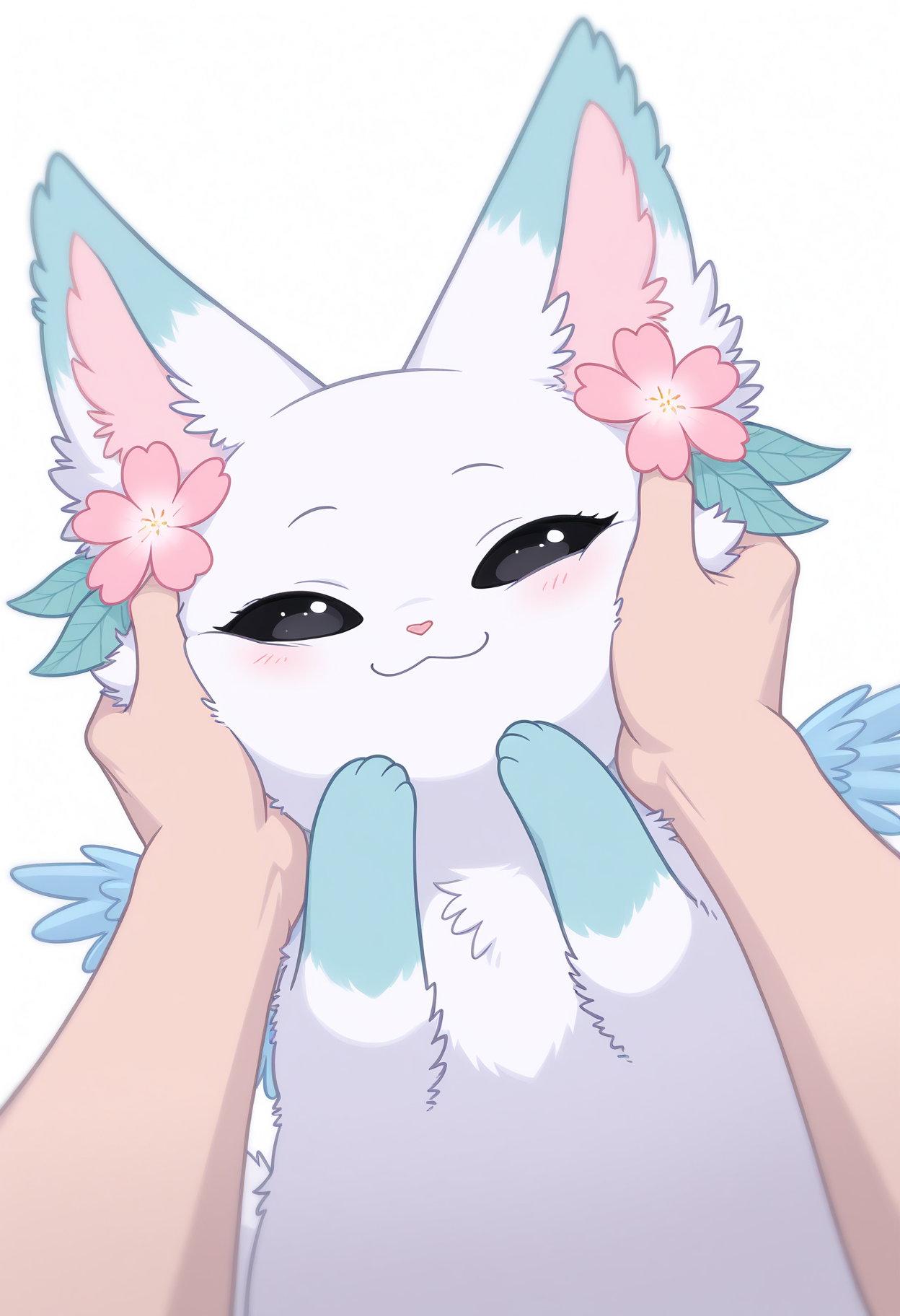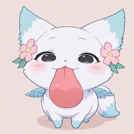 提示词: M1nto-vkstickrs,魔法狐狸,生物,白色毛发,黑色眼睛,蓝色耳尖,爪子,尾巴,小蓝色翅膀,耳后粉红色花朵,儿童风格