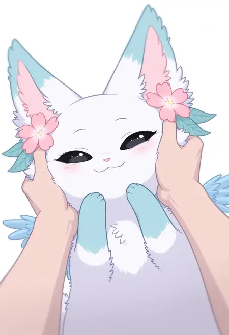 프롬프트: M1nto-vkstickrs, 마법의 여우, 생물, 흰 털, 검은 눈, 파란 끝의 귀, 발, 꼬리, 작은 파란 날개, 귀 뒤의 분홍색 꽃, 치비
