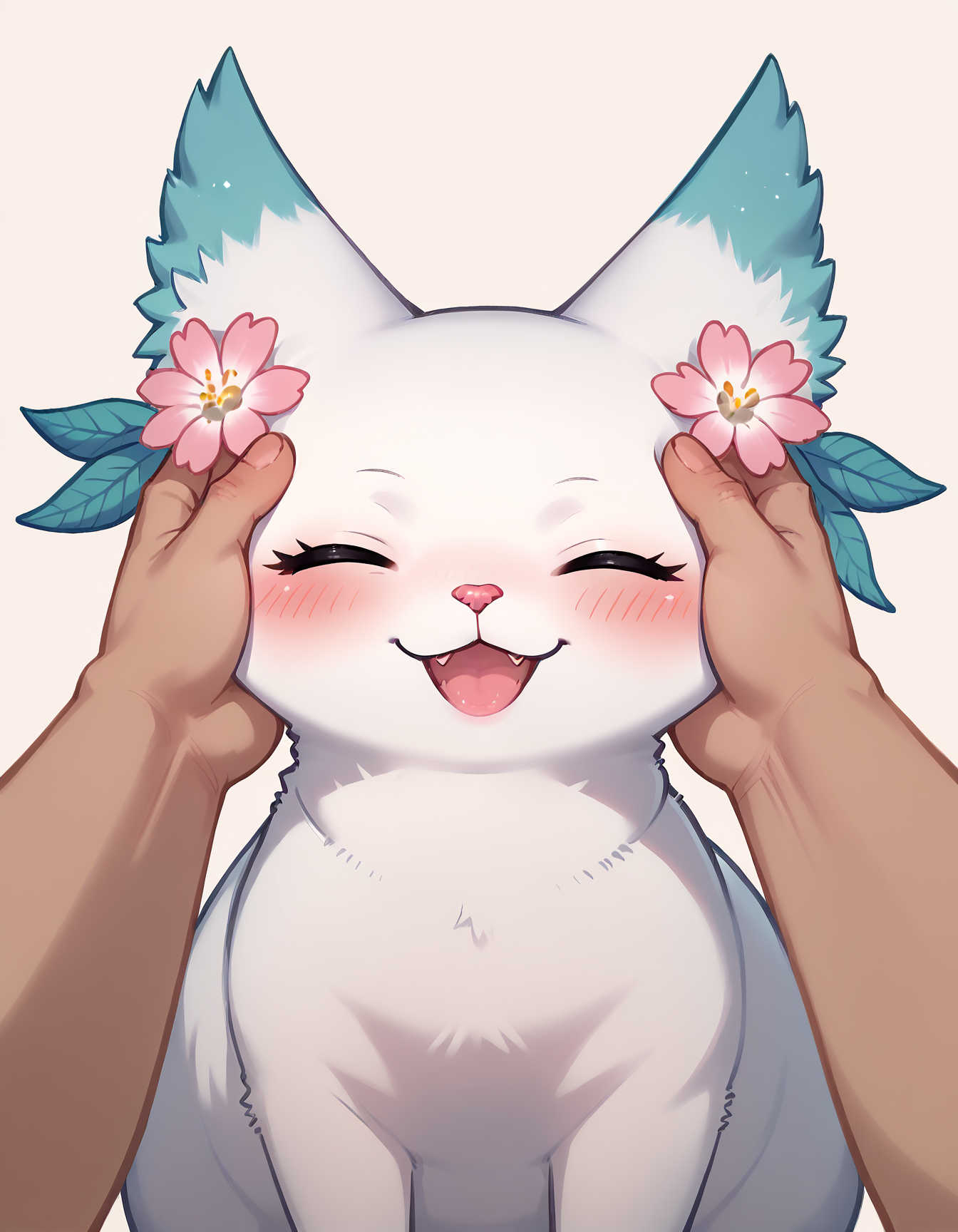 提示词: M1nto-vkstickrs,魔法狐狸,生物,白色毛发,黑色眼睛,蓝色耳尖,爪子,尾巴,小蓝色翅膀,耳后粉红色花朵,儿童风格