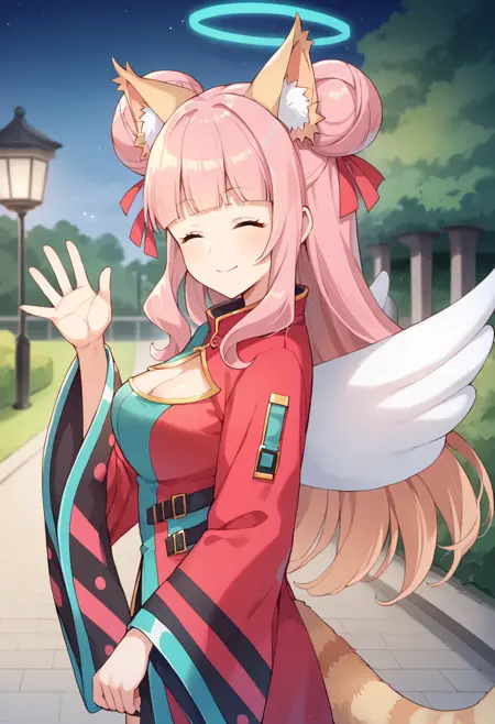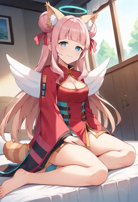 蓝色光环、蓝色眼睛、长发、齐刘海、粉发、发髻、发带、双发髻、动物耳朵、翅膀、尾巴