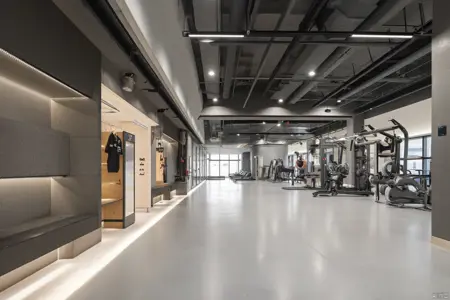 1.Indoor gym, modern gym, light gray floor, industrial style, SPA 2.Indoor gym, modern gym, light gray floor, industrial style, sunny environment, no one, modern fitness equipment, orange and red color scheme ,SPA,