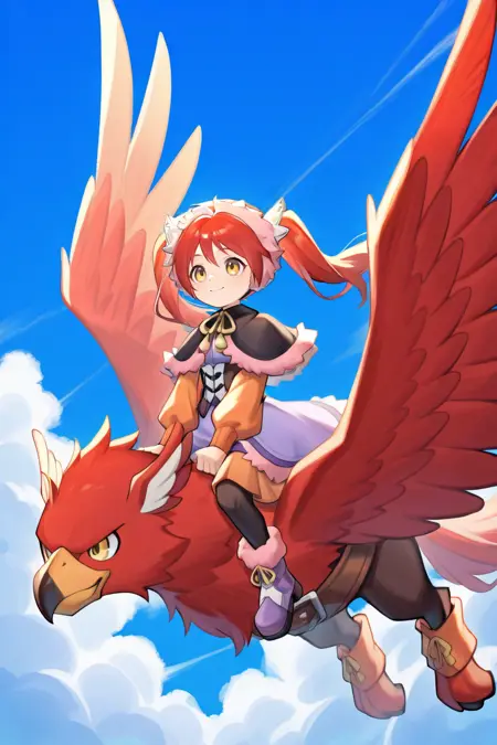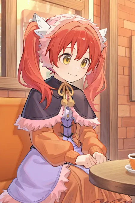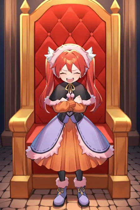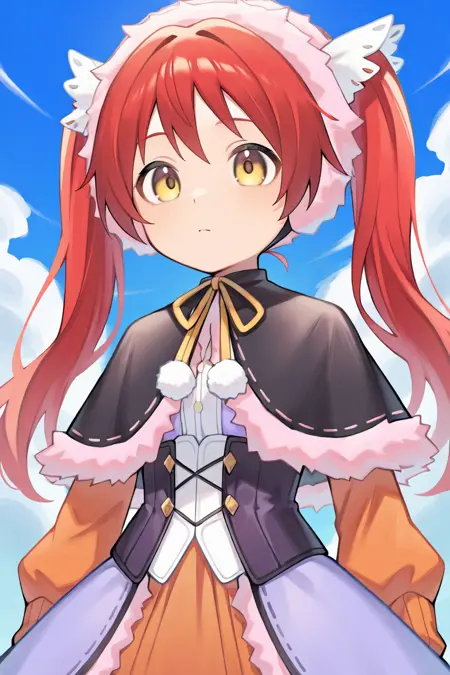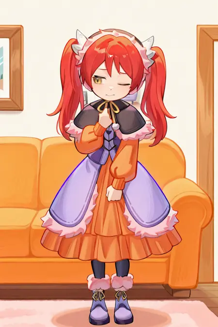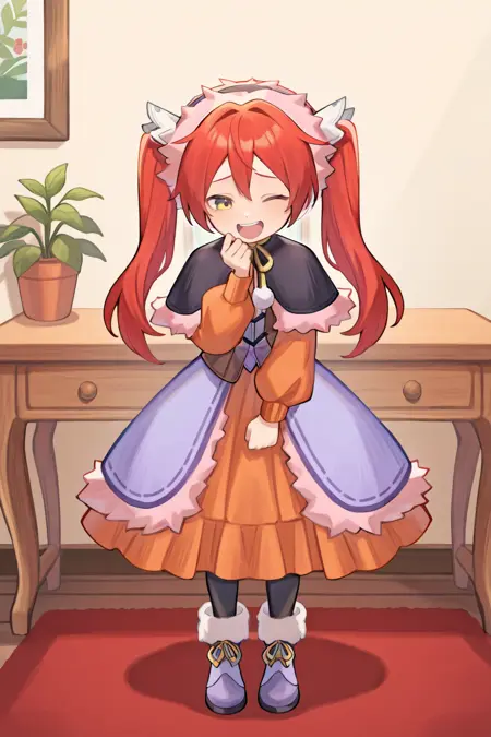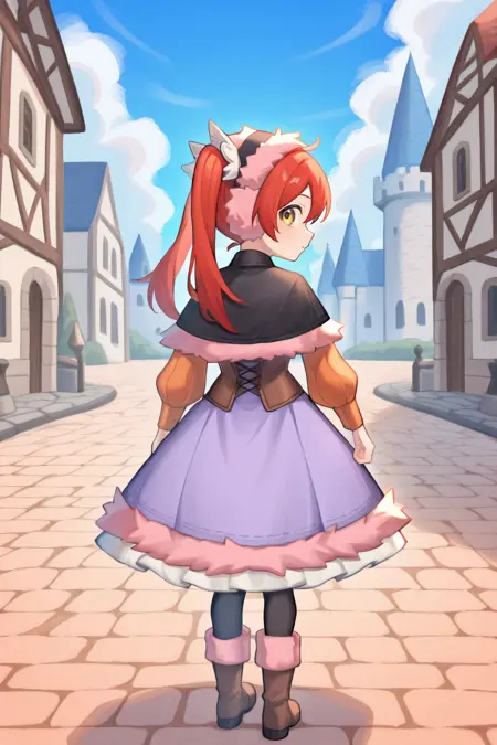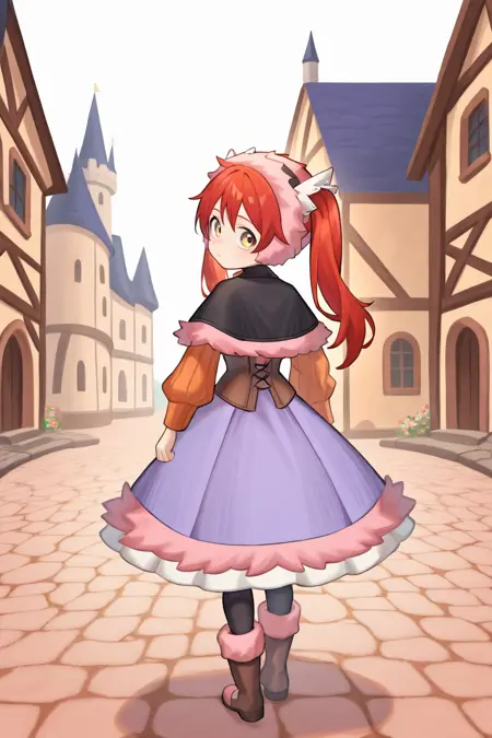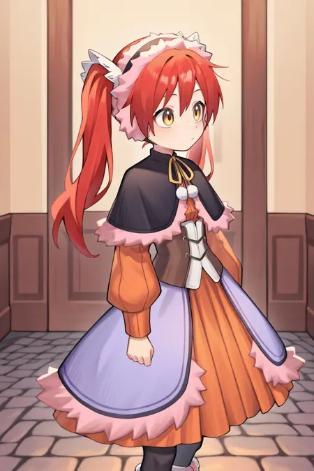 有用标签: 1个女孩,红发,长发,双马尾,黄眼睛,粉毛边,毛边发带,毛边小斗篷,黑色小斗篷,长袖,橙色袖子,毛边连衣裙,(紫色连衣裙),(裙摆位于连衣裙下),橙色裙子,紧身胸衣,(层叠连衣裙),颈带,黑色连裤袜,靴子