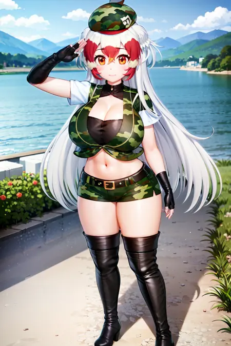 red hair, orange eyes, multicolored hair, (white hair),head wings, bird tail, hair between eyes, long hair,bird girl, short hair,large breasts, chubby_thighs, / (white shirt), white skirt,thighhighs, red bow, bowtie,shirt, short sleeves, pleated skirt, boots, red bowtie, thigh boots,
