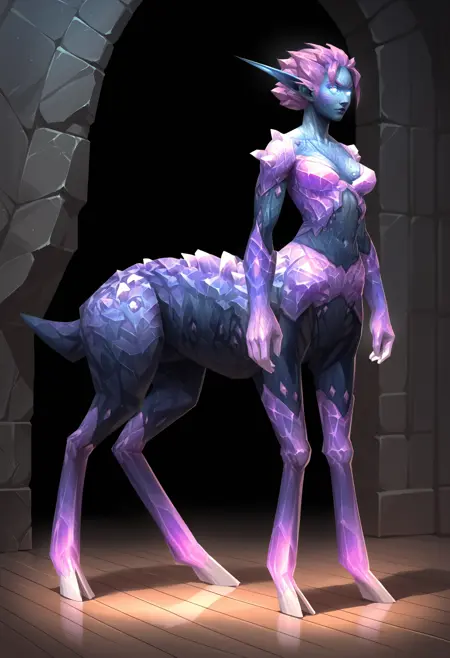 • 1girl, breasts, colored skin, blue skin, pink hair, pointy ears, monster girl, white eyes, glowing eyes, crystal, taur, tail