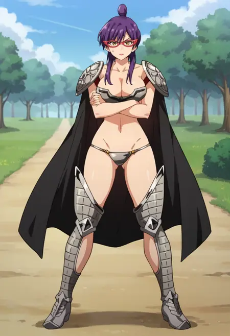 mye,1girl,solo,yellow eyes,purple hair,single hair bun,long hair,large breasts,cleavage,red-framed eyewear,bikini armor,navel,shoulder armor,armored boots,black cape,