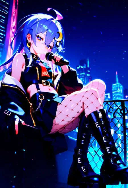 moona hoshinova, moona hoshinova \(punk rock\), crescent hair ornament, fishnet pantyhose, neon lights, long hair, ahoge, chain-link fence, purple hair, black skirt, purple eyes, midriff, pleated skirt, crop top, navel, knee boots, arm belt, building, black gloves, miniskirt, shirt, sleeveless jacket, cityscape, see-through, earrings, multicolored hair, black jacket, zipper, black vest