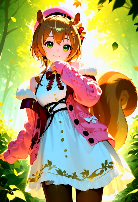 ayunda risu, ayunda risu \(1st costume\), squirrel girl, squirrel ears, green eyes, squirrel tail, brown hair, pink headwear, beret, dress, pink cardigan, leaf hair ornament, fur trim, acorn, shoulder cutout, red bow, pantyhose, pink jacket, pink sweater, pink hoodie