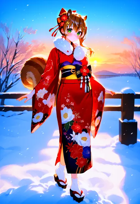 ayunda risu, ayunda risu \(new year\), squirrel girl, green eyes, brown hair, squirrel tail, floral print, squirrel ears, long hair, obi, tabi, red kimono, print kimono, hair ornament, white socks, fur collar, wide sleeves, fur trim, long sleeves, red bow, zouri