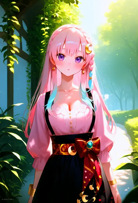 airani iofifteen, airani iofifteen \(indonesian casual\), purple eyes, pink hair, gradient hair, braid, long hair, blue hair, hair ornament, crescent, light pink shirt, black skirt, thighlet, long sleeves, red bow, red sash