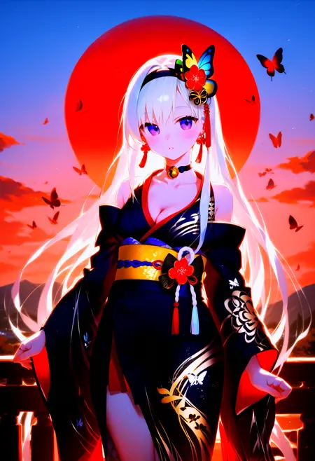 airani iofifteen, airani iofifteen \(new year\), purple eyes, white hair, earrings, choker, bare shoulders, butterfly hair ornament, hat, black kimono, bridal gauntlets, neck bell, very long hair, off shoulder, long sleeves, jingle bell, obi, dress, large breasts