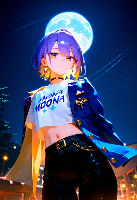 moona hoshinova, moona hoshinova \(casual\), purple hair, jacket on shoulders, short hair, crop top, purple eyes, colored inner hair, white shirt, starry hair, cropped shirt, black choker, blonde hair, black pants, clothes writing, single earring, midriff, yellow eyes, short sleeves, blue jacket, t-shirt, belt, gradient eyes