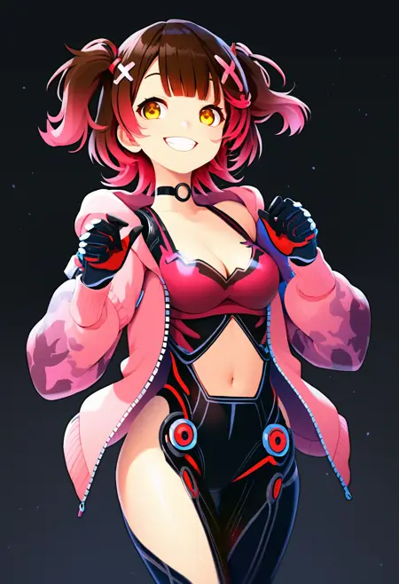roboco-san, roboco-san \(hoodie\), mechanical legs, camouflage, brown hair, eyes visible through hair, pink hoodie, android, yellow eyes, mechanical arms, hood down, short hair, long sleeves, gradient hair