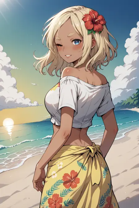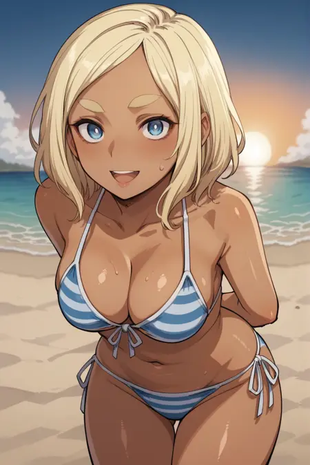 <lora:MerylXL-v1-07:0.7>, ChopioMeryl, 深色皮肤女性,长发,金发,浓眉,蓝眼睛,直视观众,