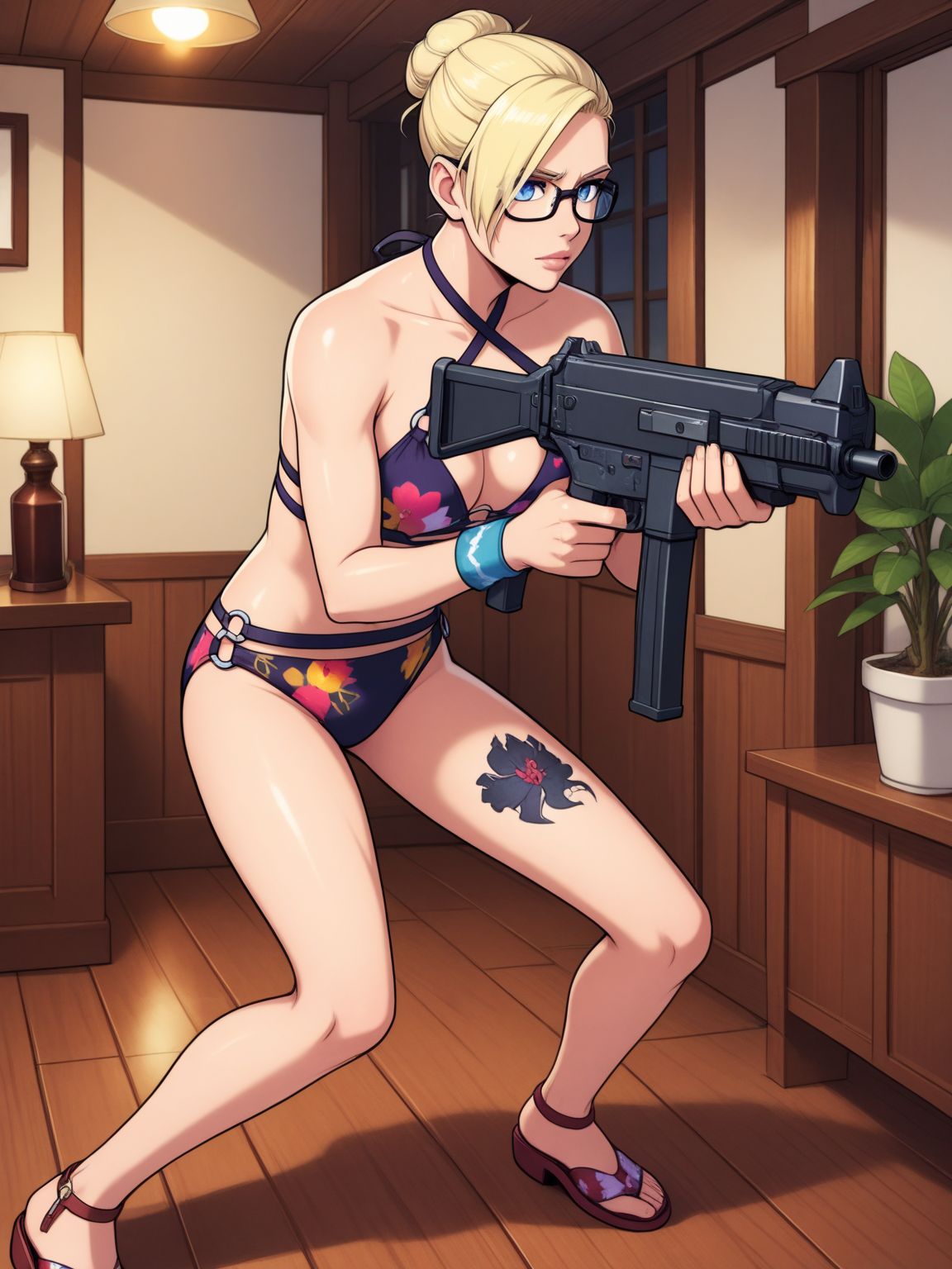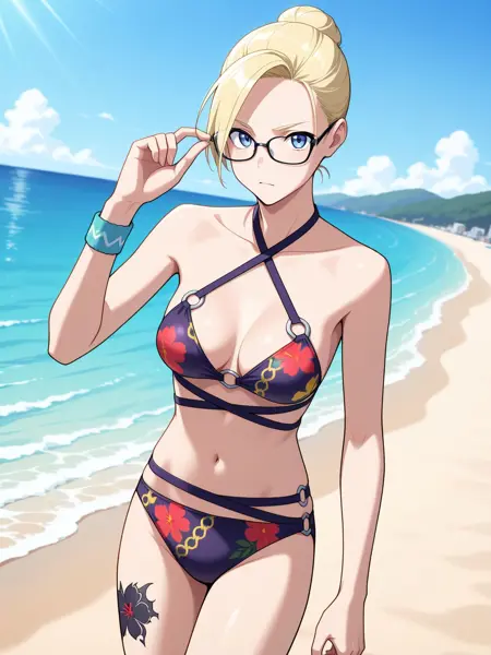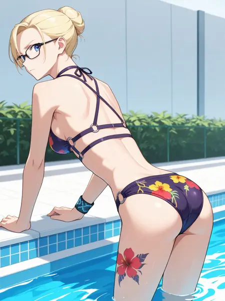 gsbikini5, 가슴, 중간 크기 가슴, 금발, 단발, 머리 뭉치, 한 개의 머리 뭉치, 올업, 파란 눈, 수영복, 비키니, 크리스크로스 홀터, 홀터넥, 검은 프레임 안경, 플로럴 프린트, 안경, O링 비키니, 보라색 비키니, 검은 비키니, 문신, 팔밴드, 다리 문신, 샌들, 플립플롭,