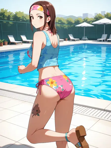 gsbikini4, 가슴, 중간 크기 가슴, 가슴선, 갈색 머리, 중간 길이 머리, 갈색 눈, 수영복, 비키니, 분홍 비키니, 헤어밴드, 이마, 탱크 탑, 플로럴 프린트, 탱키니, 파란 탱크 탑, 복부, 크롭 탑, 프린트 비키니, 소매 없음, 문신, 다리 문신, 소매 없는 셔츠, 보석, 샌들,