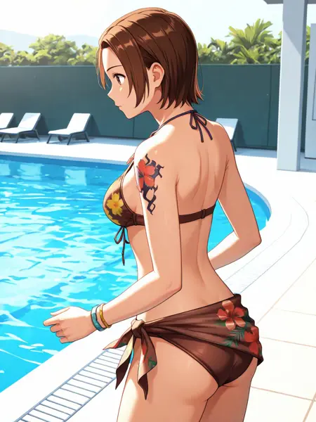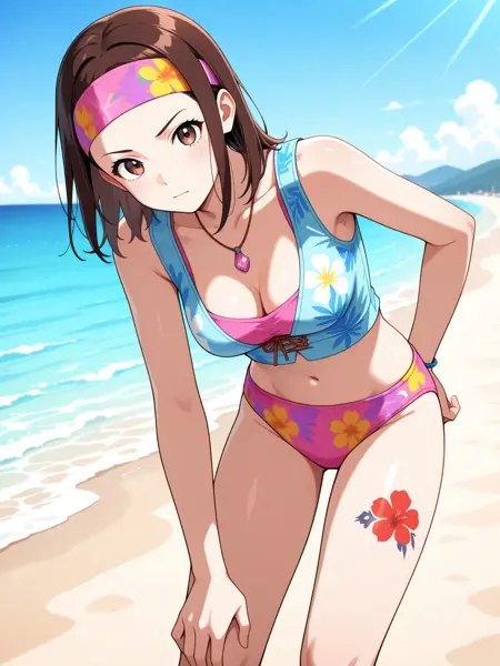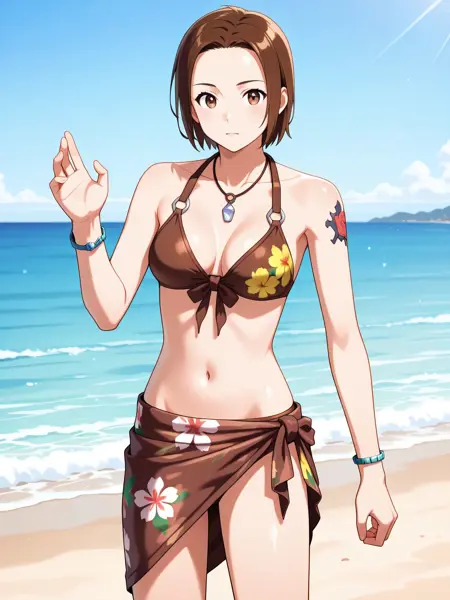 gsbikini3, 가슴, 중간 크기 가슴, 비키니, 수영복, 갈색 머리, 단발, 갈색 비키니, 갈색 눈, 앞쪽 매듭 비키니 상의, 목걸이, 문신, 사롱, 플로럴 프린트 사롱, 플로럴 프린트, 팔찌, 샌들, 플립플롭, 글래디에이터 샌들,