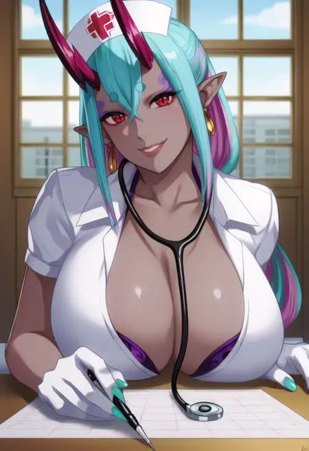 ibuki_casual, blue hair, pink hair, multicolored hair, sidelocks, hair bun, red eyes, oni, pointy ears, oni horns, colored skin, grey skin, tail, black skirt, pencil skirt, fishnet pantyhose, white shirt, open shirt, collared shirt, short sleeves, id card, lanyard, blue nails, sharp fingernails, cleavage,