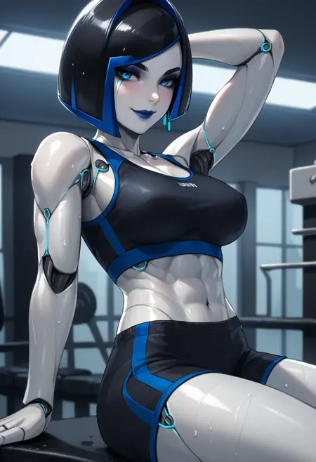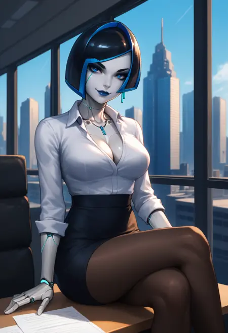 Always needed: "demidef, android, robot joints, colored skin, white skin, blue eyes, blue lipstick, eyeshadow, earrings, short hair, black hair, large breasts"