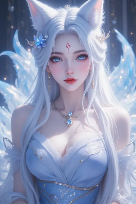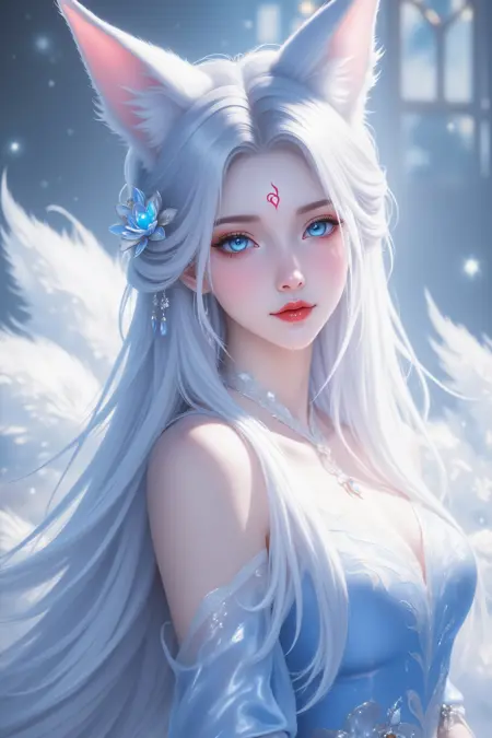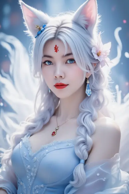 소오 바이, 긴 흐르는 흰 머리카락과 여우 같은 귀를 가진 신비로운 여성 캐릭터의 판타지 영감을 받은 초상화를 생성해라. 그녀의 큰 파란 눈은 매력적이며, 표정은 차분하면서도 신비롭다. 이마에는 빨간 마법의 문양이 있어 그녀의 초자연적인 분위기를 더한다. 그녀는 섬세하고 반투명한 소매가 달린 우아하고 반짝이는 연파란 드레스를 입고 있다. 머리카락은 풀어 놓은 땋은 머리로, 몇 가닥은 얼굴을 감싸며, 머리에는 장식용 꽃이 달려 있다. 배경은 초현실적이며 부드럽게 조명되어 있으며, 그녀를 둘러싼 부드러운 빛의 기운으로 신비와 마법의 분위기를 강조하고, 마치 천상적이거나 초자연적인 존재처럼 보인다.