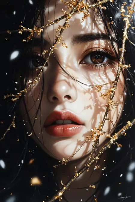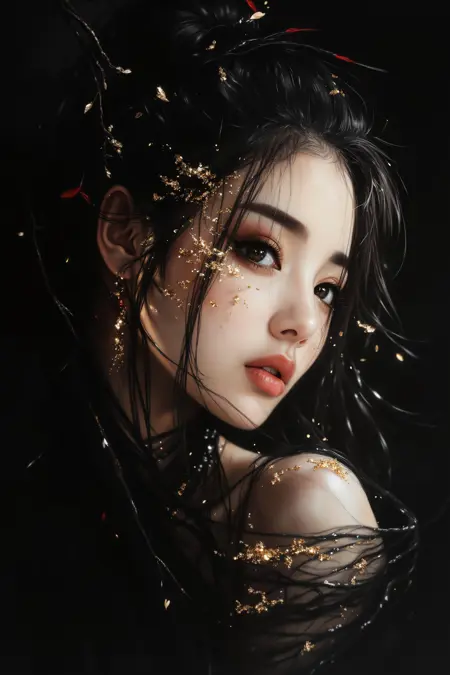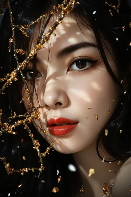 금색 예술적 얼굴, 금색 예술적 얼굴, 검은 긴 머리카락과 얼굴에 금빛 반짝임을 가진 여인, 어두운 배경에 놓여 있음. 그녀의 머리카락은 세밀한 금빛 반짝임으로 장식되어 고貴하고 위엄 있는 외모를 띠고 있음.