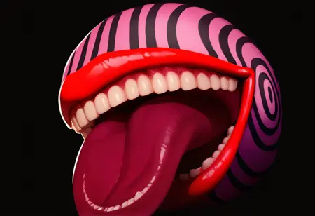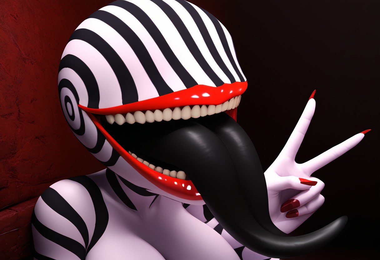긍정적 프롬프트: HablerieP, 몬스터, 빨간 입술, 큰 입, 이빨, 혀, 긴 혀, 떠 있는 머리, 눈 없음