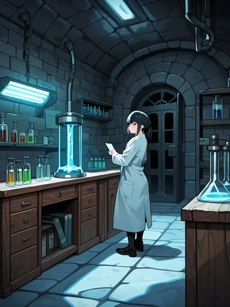 クリーpyカウント・クローリーの城の遥か下方、ファウンケンシュタイン博士の研究室より、マッド・サイエンスが登場!— 奇妙な発明や泡立つ化学薬品で満ちた、不気味でクセになる研究室を生み出すために設計されたLoRA。土曜日の朝のカートゥンのような雰囲気で、すべては楽しく仕上がっています。