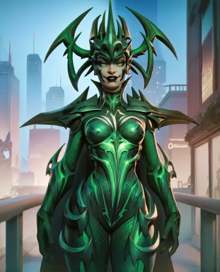 녹색 또는 검은 바디수트, 갑옷, 날카로운 돌기, 뿔 달린 헬멧, 어깨 패드, 검은 망토, 장갑 또는 발톱,