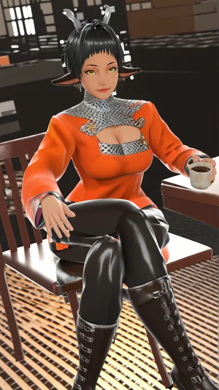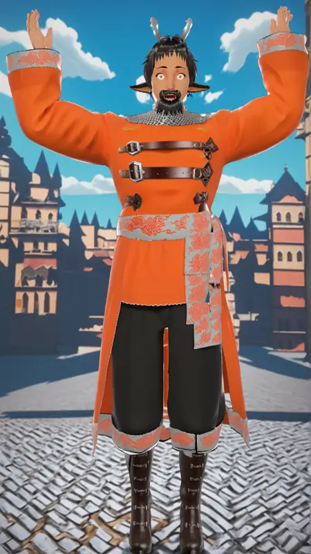 古铜色皮肤,男性,黑发,胡须,两只小巧的扭曲银色山羊角,黄色山羊眼,山羊耳朵,