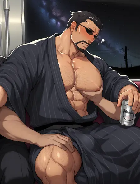 Trigger words: kasai_tatsuyoshi, mature male, short hair, black hair, hair slicked back, beard, mustache, black suit, purple necktie, collared shirt, black pants, sunglasses