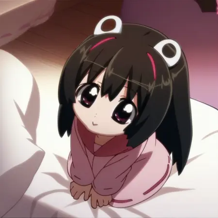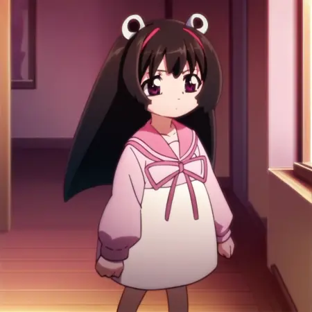Rona_Elmo、黒髪、ロングヘア、紫の目、学制服、ピンクのセーラー衿、ワンピース、黄色い靴、動物の耳、クマの耳