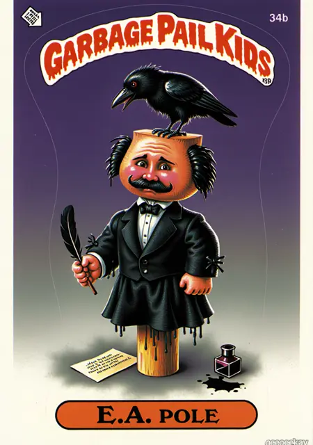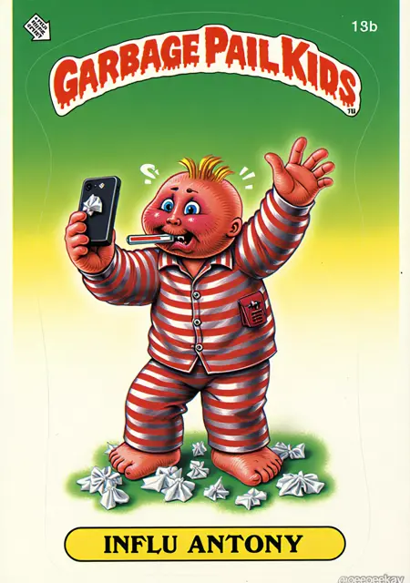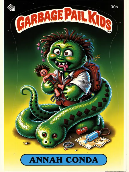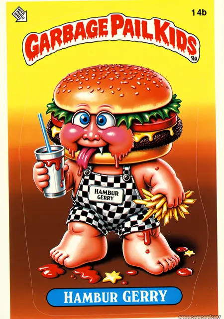 Begin your prompt with: The image showcases a card from the "GARBAGE PAIL KIDS" series. The card features a character named 'CHAR NAME'. 'CHAR NAME' is and start describing character, background, objects etc.