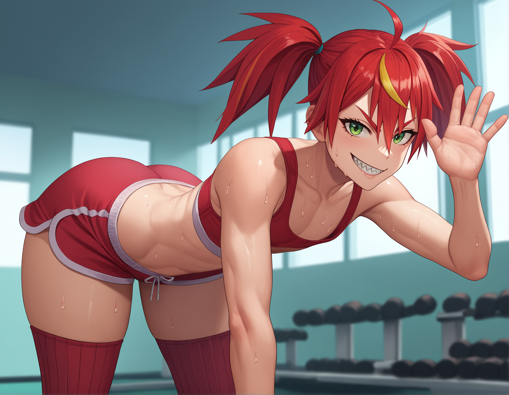 "mizarisa, red hair,twintails,streaked hair, sharp teeth,flat chest, green eyes"